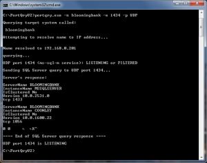 As you can see when I query my test machine, Bloomingbank, it returns info about the 2 instances of SQL Server on that machine. One is the default instance (always named "MSSQLSERVER") which is available at TCP 1433, and the other is named "COONLEY", available at TCP 1056.