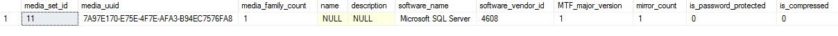1SELECT * FROM msdb.dbo.backupmediaset;Looking at the results, there's not a whole lot to a media set. It's mostly identifiers and a few properties. There's nothing in there at all about the backup itself; the media set is merely a container that holds backups. Information about the backup is stored as part of the backup set, which has its own table in msdb. The following query displays information about the backup set. Fill in the media_set_id value from the media set query above before running it.
